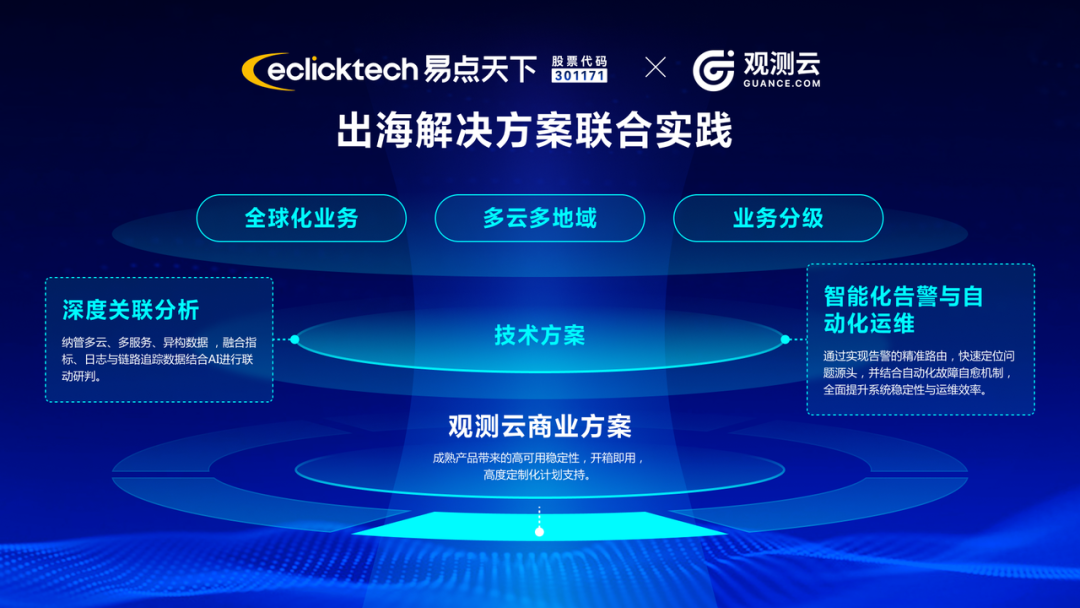 在实践中,开源方案成本低、可定制性强,但需额外开发跨地域数据同步、数据压缩与降采样算法、多语言链路追踪等功能,同时针对中东、拉美等弱网地区,还需重点优化数据传输的稳定性与延迟控制。相比之下,商业方案具备开箱即用、专业团队支持等优势。例如:易点天下与深度合作伙伴观测云的联合实践,不仅快速实现了跨云厂商、跨地域的数据整合,还原生支持合规审计、智能告警等功能。目前,双方已共建专属监控区域,提供场景化的定制能力。
